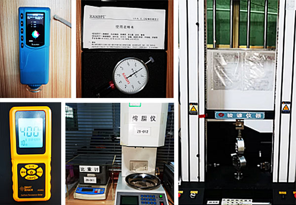 本公司拥有万能材料试验机、标准光源箱、熔脂仪、比重计、硬度计、游标卡尺、厚度规等专业的检测设备。